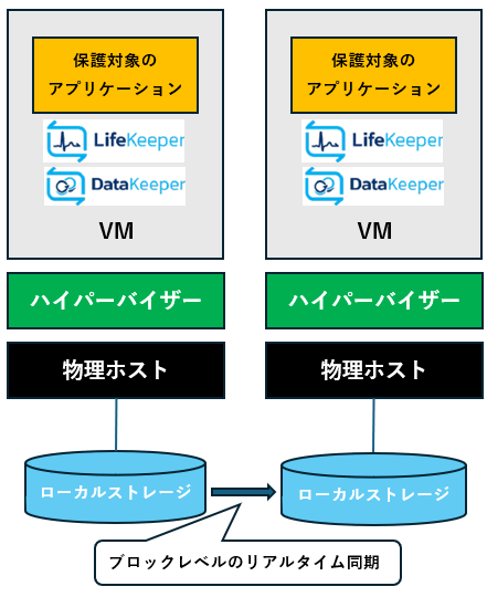 特にVMwareの「vSphere HA」と比較した場合、ESXiホスト障害時にはLifeKeeperの方が障害検知から復旧までの時間が短いというメリットがあります。(LifeKeeperでは、待機系ESXiホストがあらかじめ起動状態で待機しているため、再起動が必要となるvSphere HAよりも迅速なフェールオーバーが可能。)