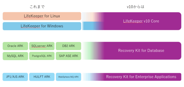 こちらの図が示すように、これまでLinux版とWindows版とは別のバージョンでリリースされており、同じLifeKeeperという名前であっても、製品仕様が異なるなどとても解り辛い状況にありました。しかしv10からはLinux版とWindows版が統合されます。これは単にバージョンが同じv10になるというだけでなく、OSによる仕様の違いは多少は残るものの、製品として設計思想ができるだけ共通化されるようになりました。