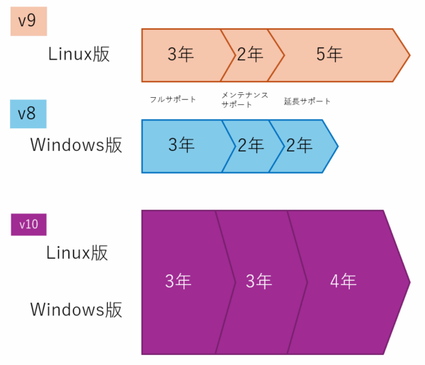 これまではLinux版(5年)とWindows版(2年)とで延長サポートの期間が異なるなど、OSごとに考え方が異なっていましたが、こちらも見直されフルサポート3年、メンテナンスサポート3年、延長サポート4年と統一されました。