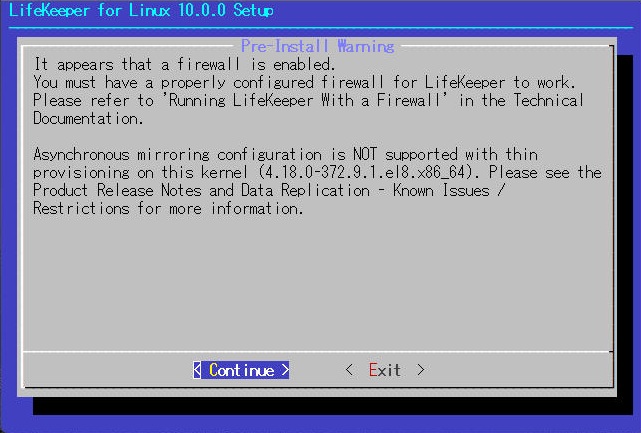 14.スタンバイサーバと同様に、『Pre-Install Warning』のファイアウォール警告が表示されますので「Continue」を選択して