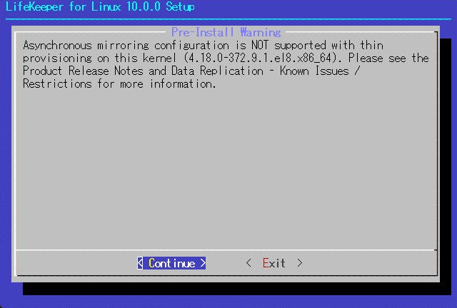 | [root@rhel02 ~]# mount /work/LifeKeeper_linux_10-0-0.img /media -t iso9660 -o loop mount: /media: 警告: デバイスは書き込み禁止です、読み込み専用でマウントします。 [root@rhel02 ~]# cd /media [root@rhel02 media]# ./setup |