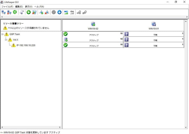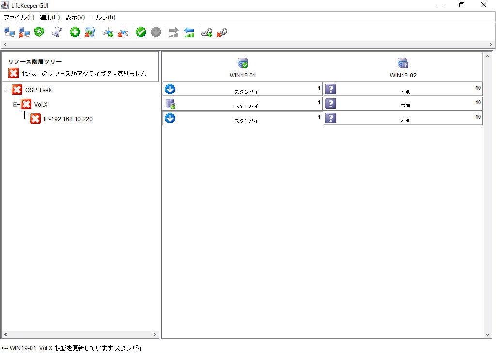 20.スタンバイサーバの LifeKeeperGUIを起動すると、本バージョンアップでは対向側のステータスが「不明」になっていますので