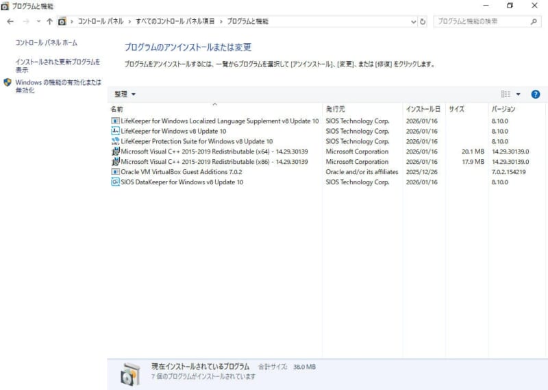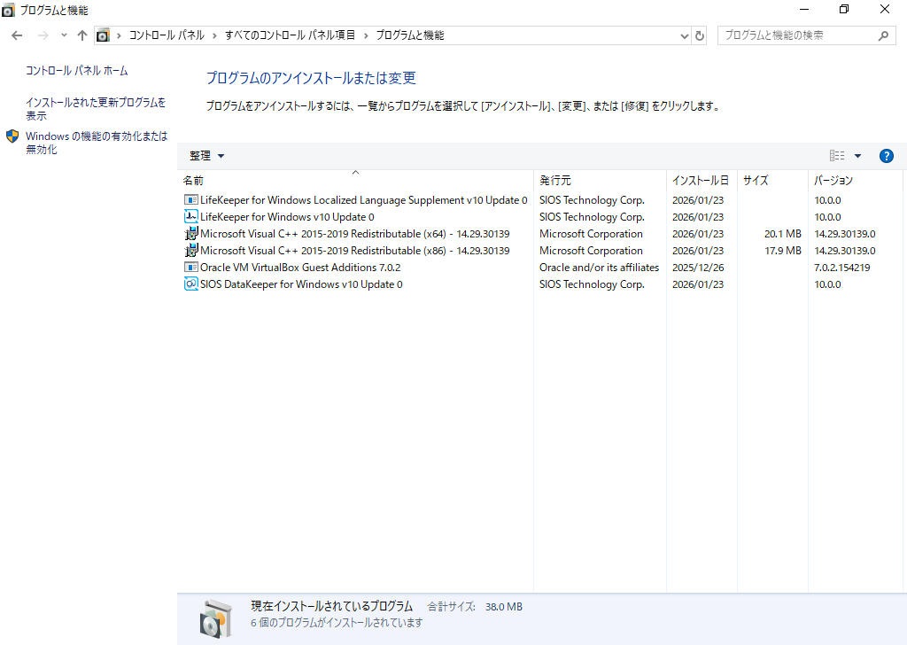 38.アクティブサーバの「プログラムと機能」からLifeKeeperバージョンを確認します。