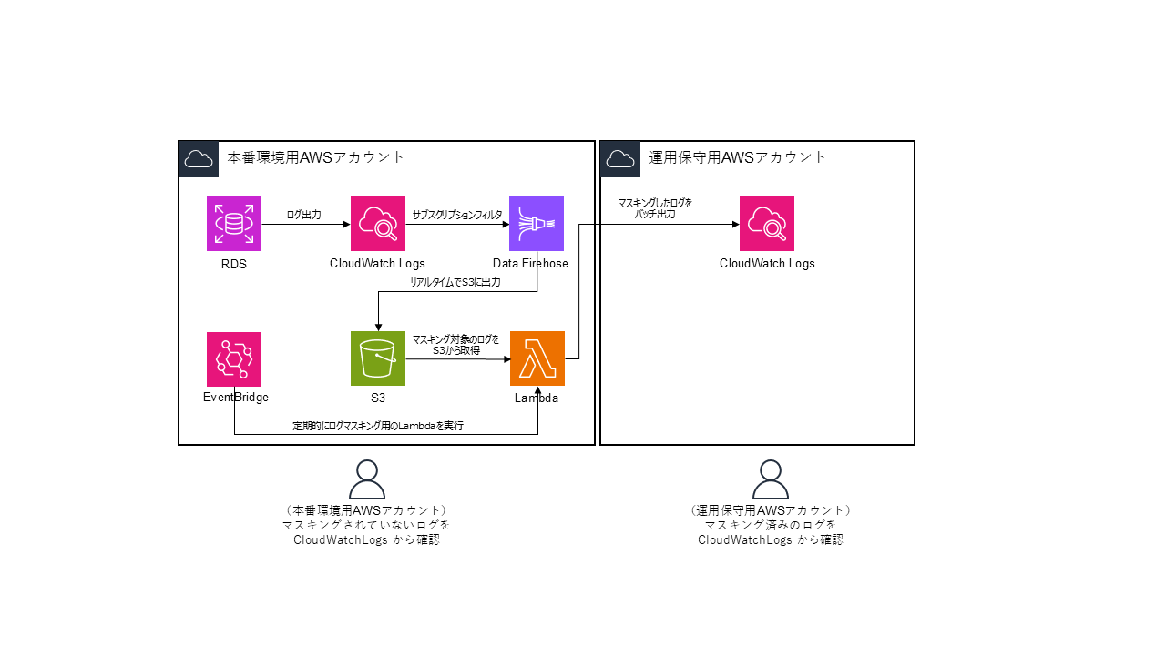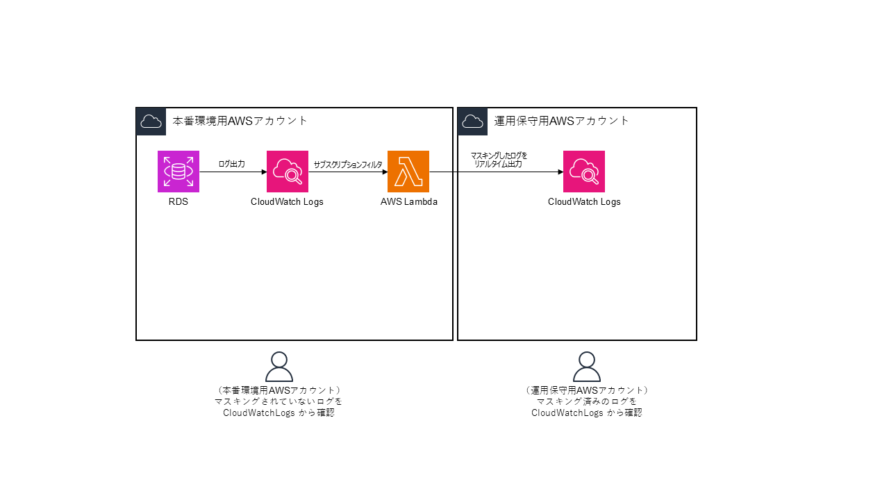 • 運用保守用 AWS アカウントの Cloudwatch Logs に本番環境用 AWS アカウントで出力されたログを転送し、その際にログの一部をマスキングしたい
