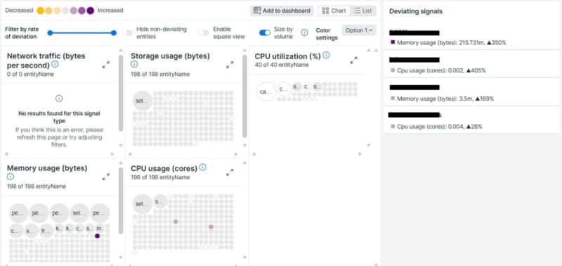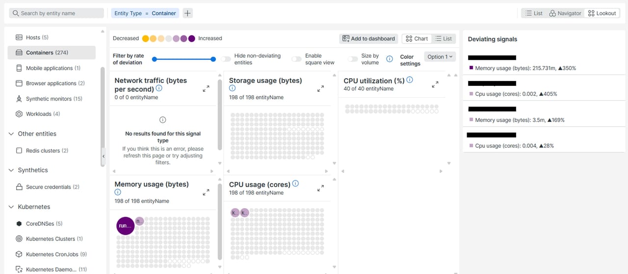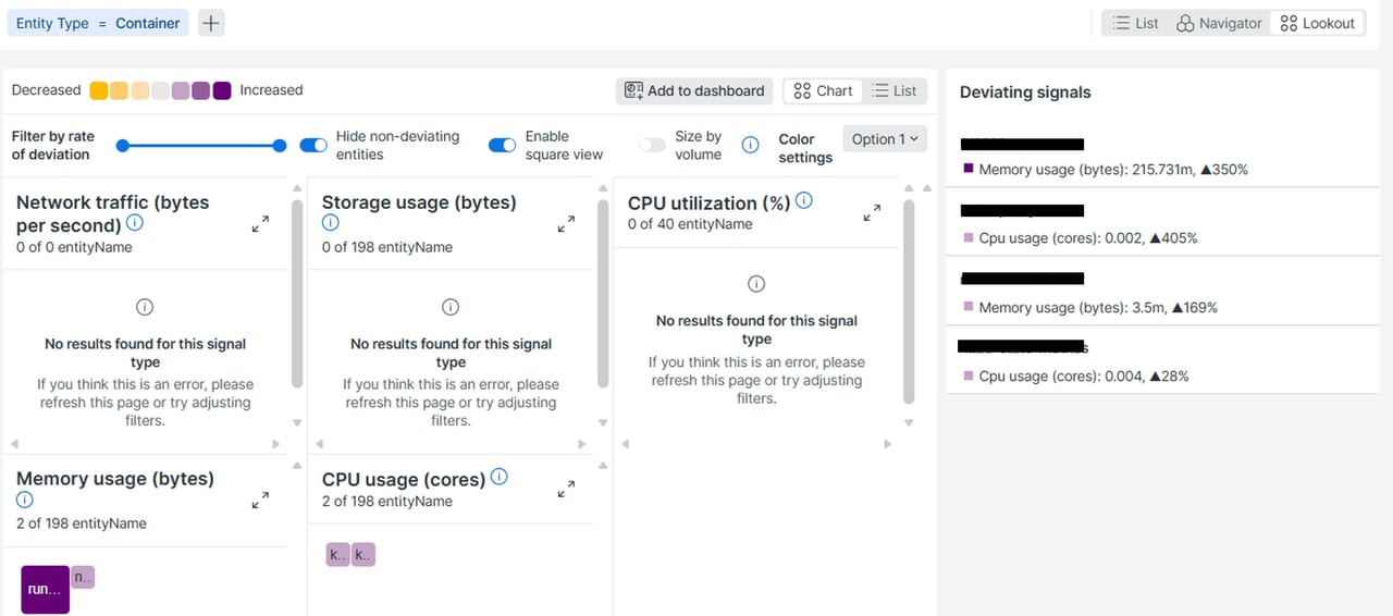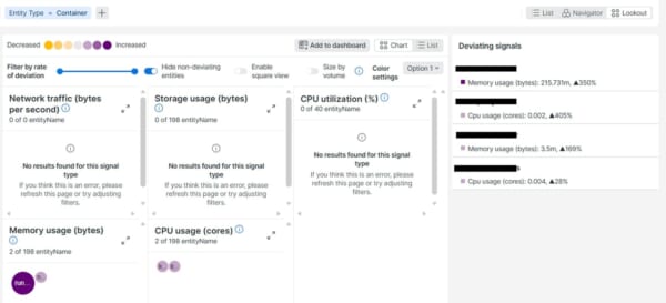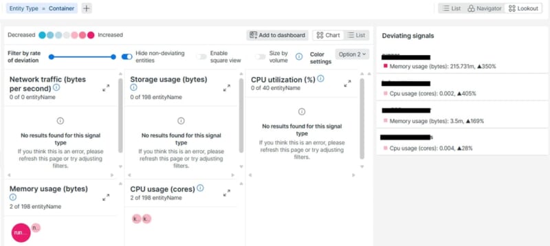 最近の異常な変化の大きさを色付きの円にて視覚化する画面です。過去1時間の平均と直近5分間のデータを比較し、通常の動作から逸脱しているエンティティを視覚的に表示します。円のサイズで変化の規模を表し、色で変化の方向(増加・減少)を示しています。アラートの閾値に達する前に過去1時間前と直近5分間のデータを比較するため、リソースの急激な変化の予兆を察知することができます。この画面は右上のNavigatorのとなりに表示されているLookoutからアクセスできます。