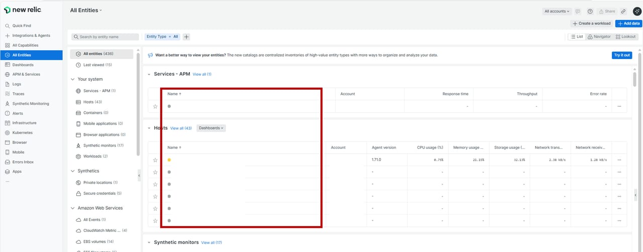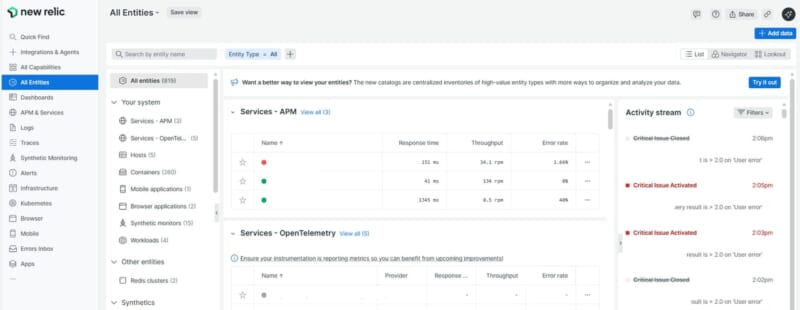 New Relicが対象のアカウントで観測するすべてのリソースを集約し、問題の特定やパフォーマンス分析するための中心的な画面になります。All Entitiesをクリック後に、リスト形式でエンティティが表示されています。何が観測対象として登録されているか、どこのエンティティに問題があるかをすばやく把握するための始点になります。