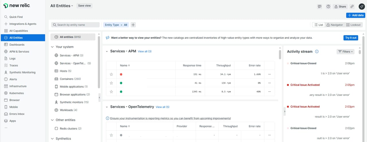 一元管理されたエンティティをわかりやすく表示するため、New RelicはUI機能が充実しています。用途に応じて使う機能は異なるため、この記事では代表的な画面の見方を解説します。