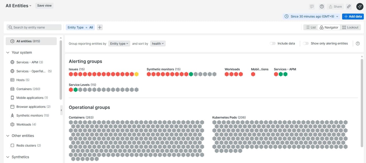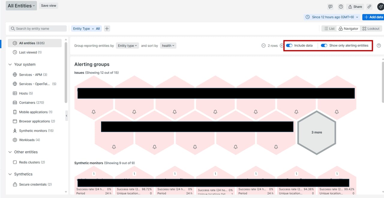ハニカムアイコンで何のエンティティかわからない場合は、Include dataのピッカーをオンにすることで、ハニカム内にエンティティ情報が表示されます。また、「Show only alerting entities」のピッカーをオンにすることで、アラートが起きているエンティティのみに表示を絞ることができます。