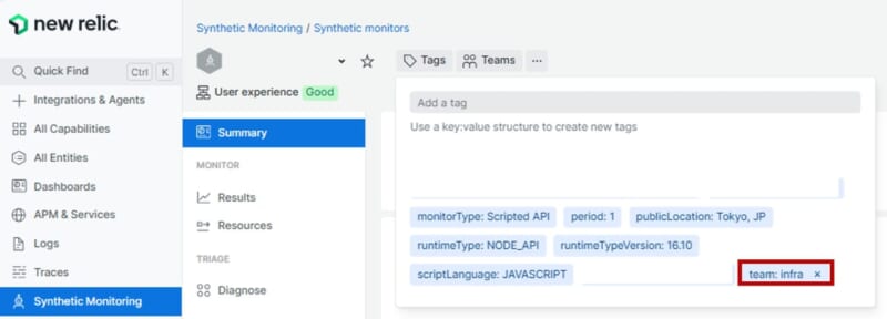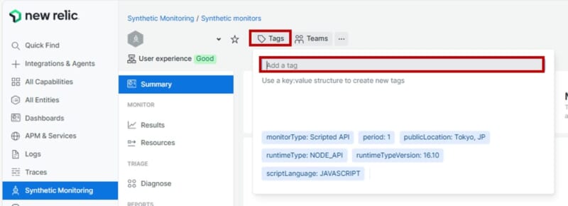 New Relic コンソールからタグを付ける方法は、以下の画面以外にもあります。一例として解説します。タグ付け後、タグを使って検索したい場合、反映に数分程度がかかることがあります。