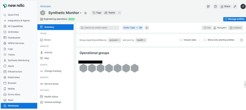 New Relicの観測対象全体の健全性をハニカム表示で確認する画面です。大量のエンティティを色によって状態確認できるように設計されていますので、視覚的にどこのエンティティに問題があるかがすぐに分かります。この画面は右上のListのとなりに表示されているNavigatorからアクセスできます。