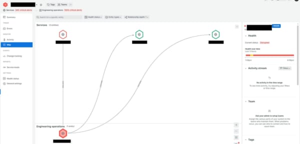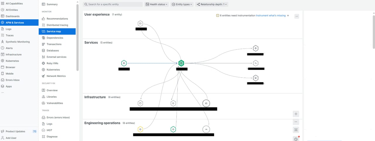 フロントエンドからバックエンドまでのアーキテクチャ全体を視覚化し、システムを構成するアプリケーション、データベース、ホスト、外部サービスなどの相互関係を動的に表示します。Webサイトやアプリの表側(フロントエンド)から裏側(バックエンド)まで、どんな部品がつながっているかを地図のように示すため、対象のエンティティがどこでつながっているのか、どのエンティティにも影響があるのかを一目でわかることができます。