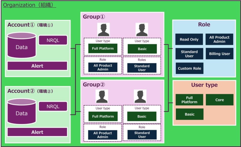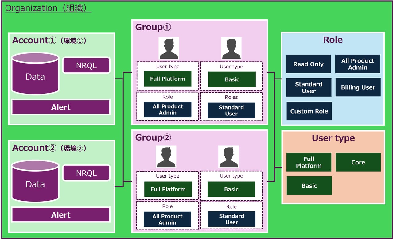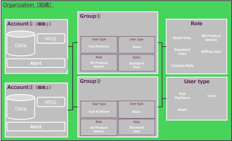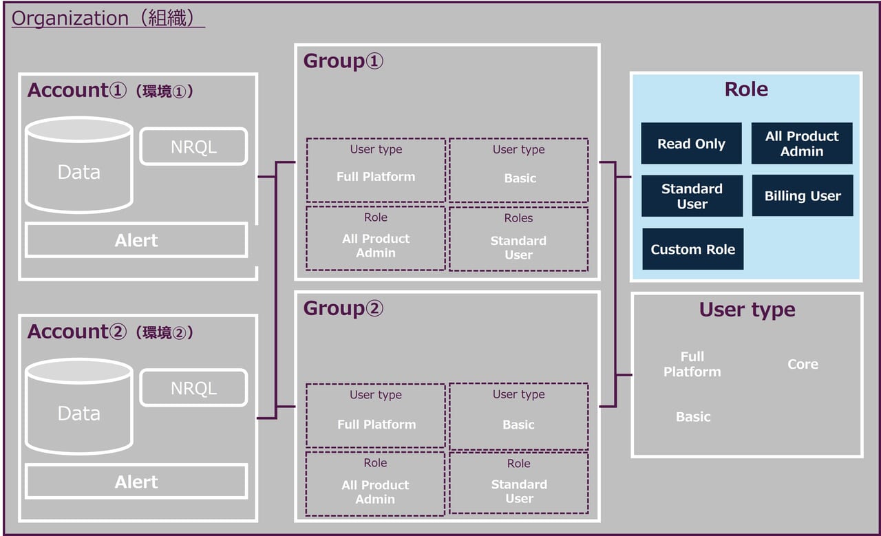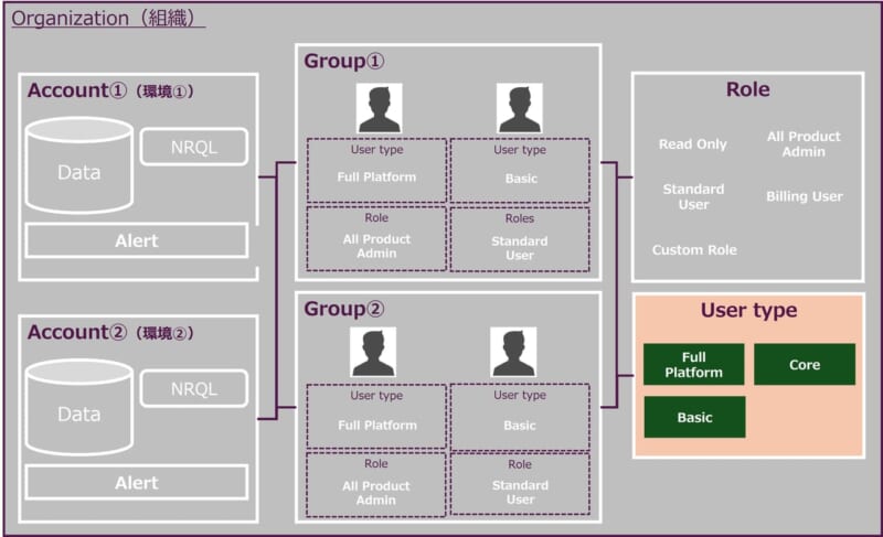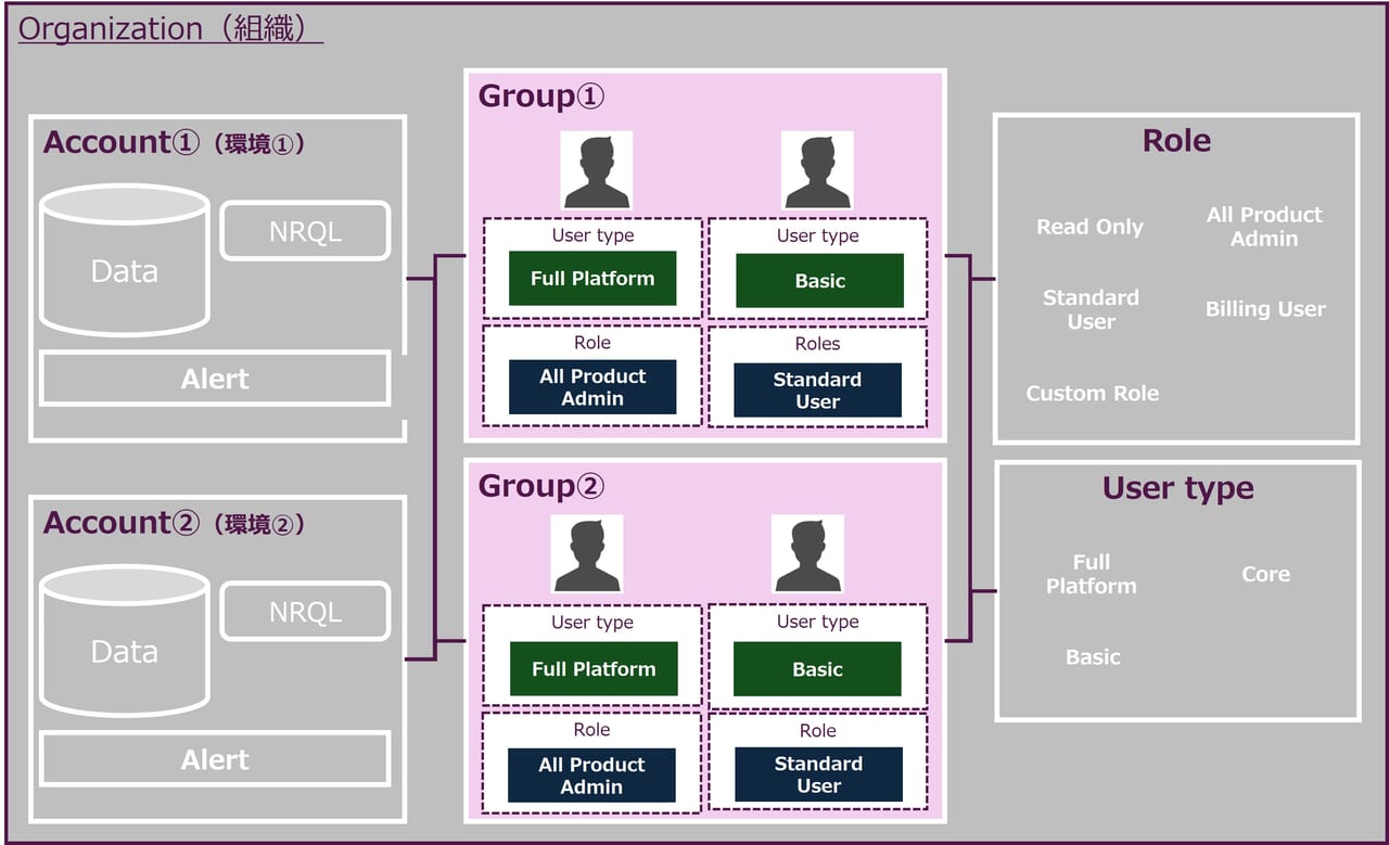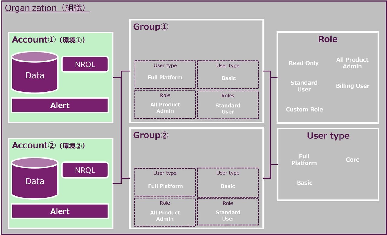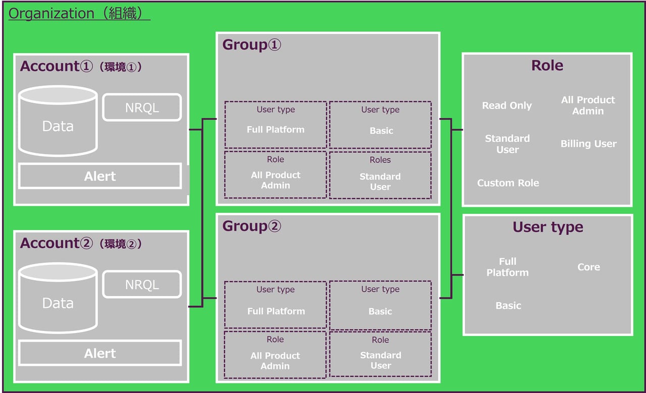 | ユーザー(User) | New Relicコンソールを操作する人。ロールとユーザータイプを組み合わせて、柔軟に権限のコントロールが可能。ユーザーは1つ以上のグループに所属する必要があります。 |