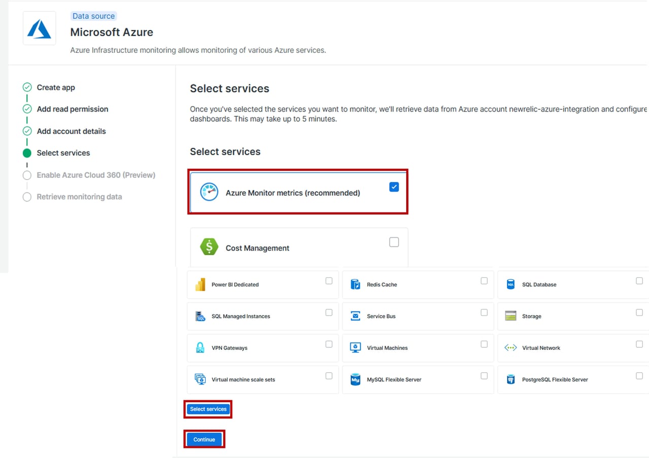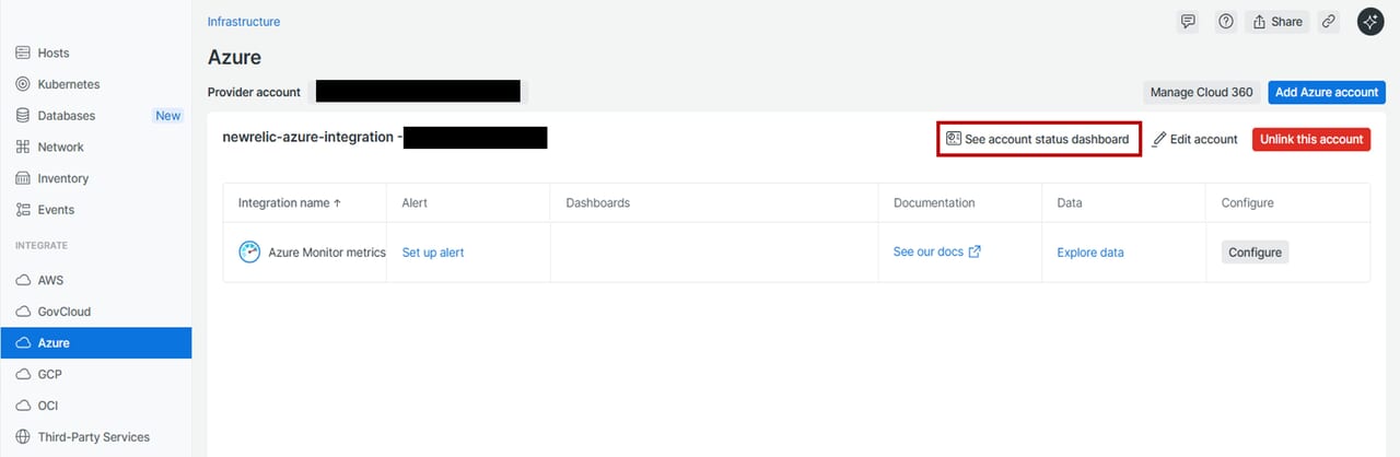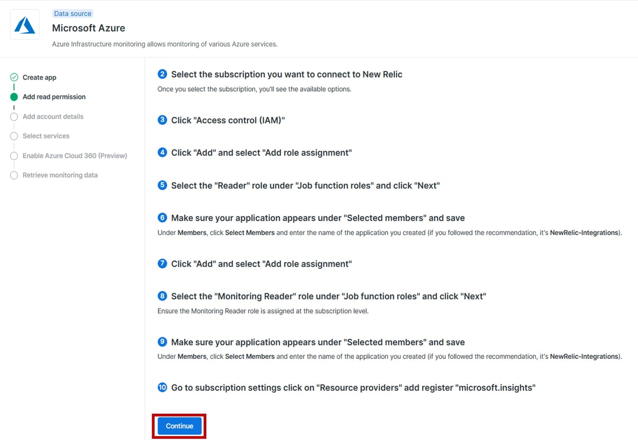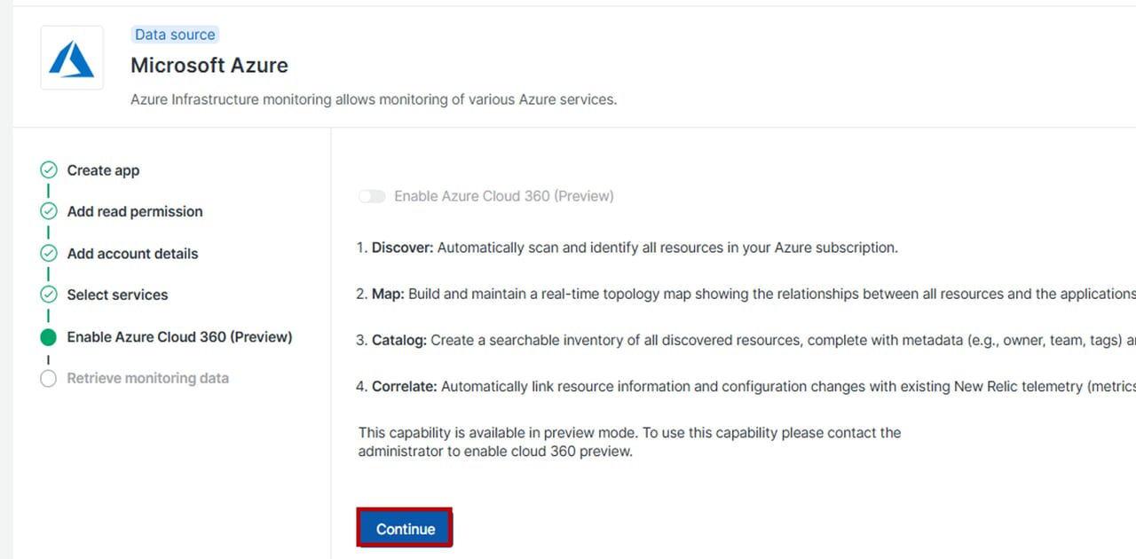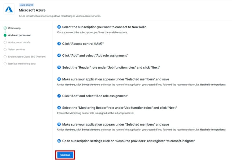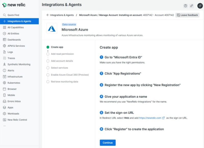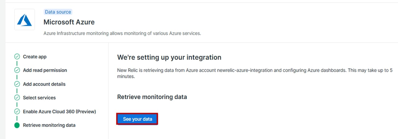 Azure側でNew Relicインテグレーションに必要な設定を完了後、続いてNew Relic側でAzureからデータを取得するための設定を行います。