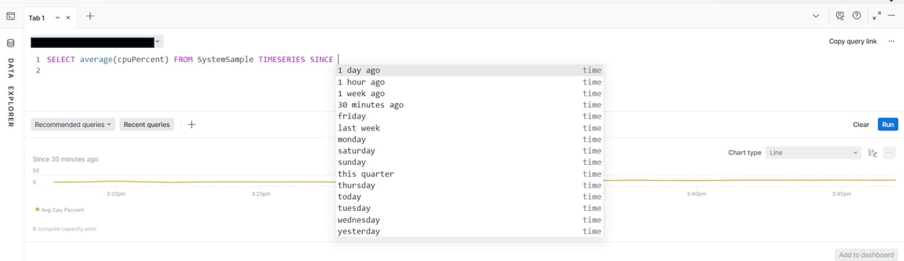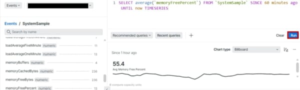 | 3.自動補完機能があるため、入力補完機能を使ってリストから選択しながらNRQLを作成できます。作成後、「Run」をクリックすることで、該当のグラフが表示されます。 | |