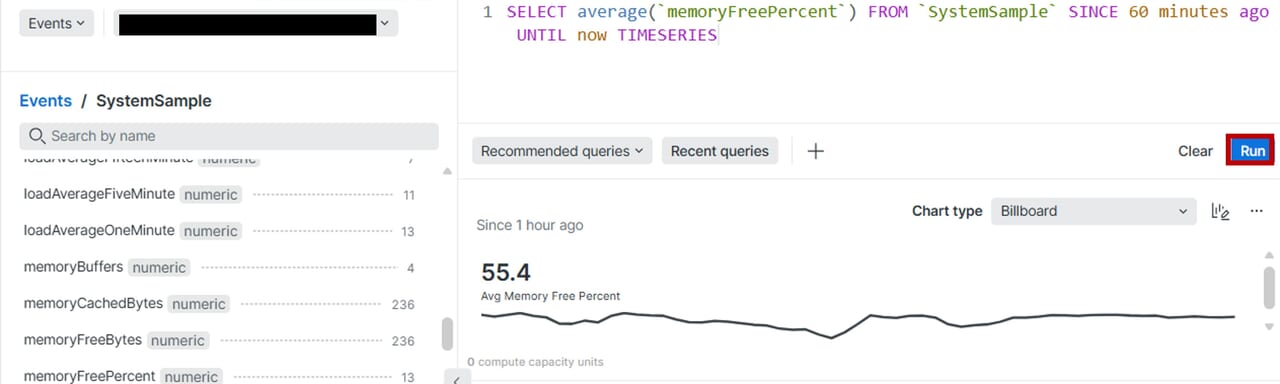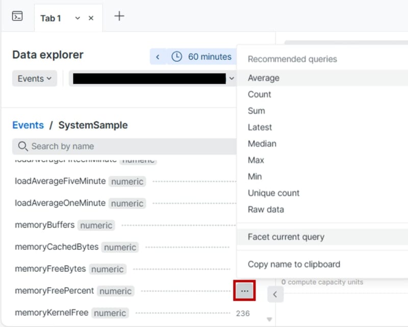 実際にデータエクスプローラを使ってNRQLの構文を作成します。今回は、メモリの空き容量の平均を調べる例を基に進めます。そのためには、メモリの空き容量がどのデータのイベントタイプに含まれているかを、事前にNew Relicのデータ辞書で確認する必要があります。ここでは、データ辞書にアクセスしてどのイベントタイプに格納されているか確認済という前提で手順を解説します。