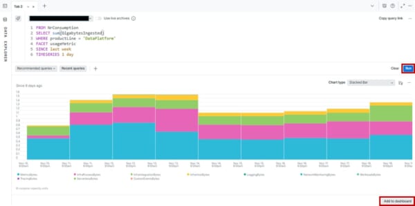NRQLからデータ分析した結果を定常的に確認したい場合、ダッシュボードに追加して閲覧することができます。ここでは、NRQLから作成したデータをダッシュボードに追加する方法を解説します。