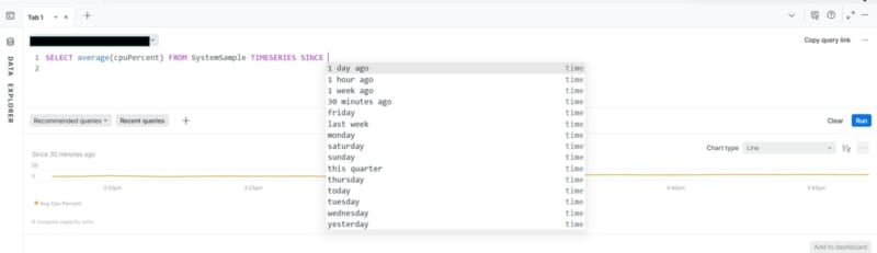 例えば、イベントタイプ Transaction には appName や duration などの属性があります。FROM Transaction SELECT duration と記述するとトランザクションの処理時間を返します。メトリクスの場合は時間の経過とともに変化する数値を分析できます。 FROM Metric SELECT average(aws.ec2.CPUUtilization) と記述するとAWS EC2のCPU使用率を集計します。メトリクスの場合の構文はFROM Metricとして固定で使用します。いずれもSELECTから始めるかFROMから始めるか指定はありません。