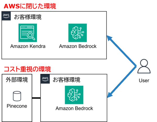 InfoWeaveでは、RAG検索用のベクトルデータベースとしてPinecone, Knowlege Bases (Amazon OpenSearch Serverless), Amazon Kendraを選択可能としており、以下のように目的に応じてお客様に最適なLLMとベクトルデータベース組み合わせを選んでいただけることが魅力の1つとなっています。
