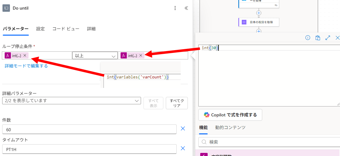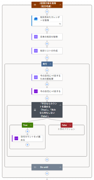 「Do until」は、指定した条件を満たすまで、中のアクション(1日進めて平日か判定する処理)をぐるぐると繰り返し実行するアクションです。