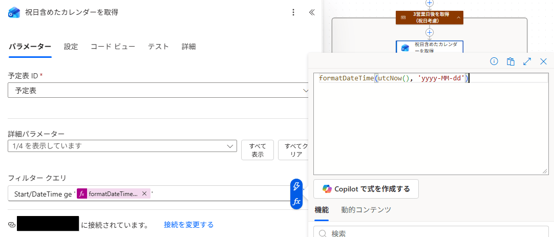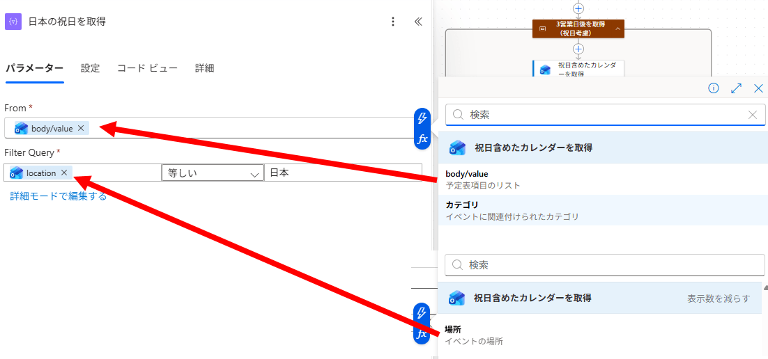 そこで、「アレイのフィルター処理」アクションを使って、純粋な「日本の祝日」だけを抽出(絞り込み)します。
