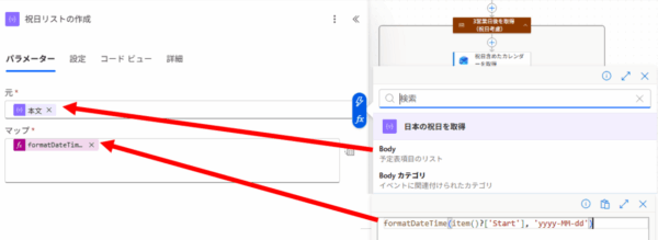 contains(body(‘祝日リストの作成’), formatDateTime(variables(‘varTargetDate’), ‘yyyy-MM-dd’))