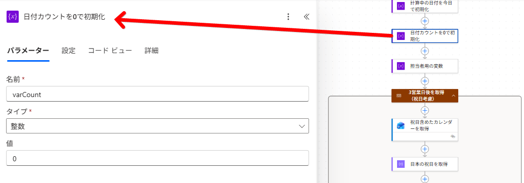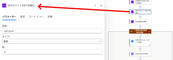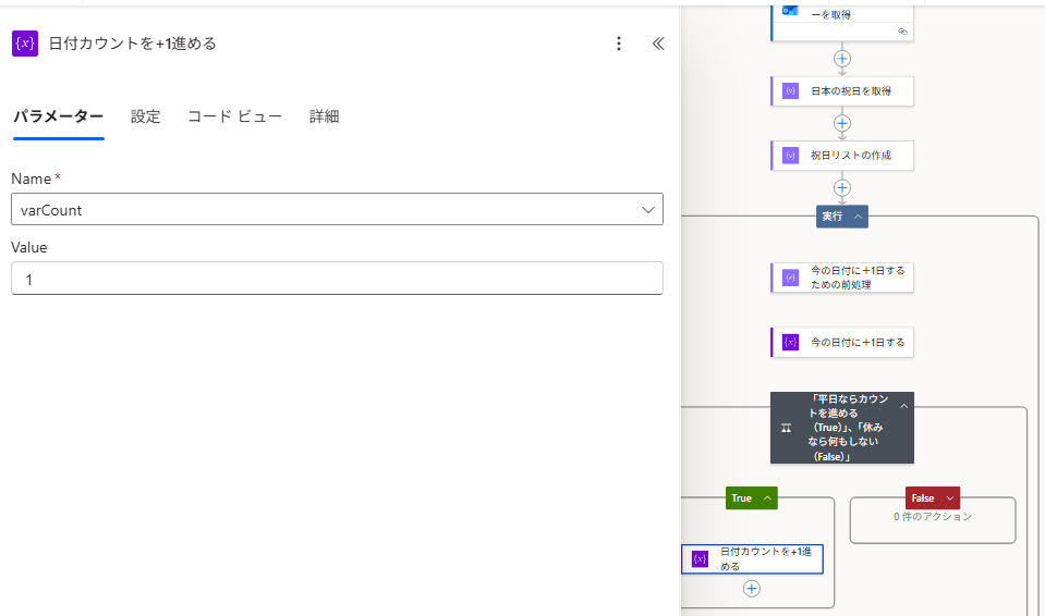 ⇒カウントを貯めている変数 variables(‘varCount’) は、平日と判定された時だけ「+1」されていく変数です。