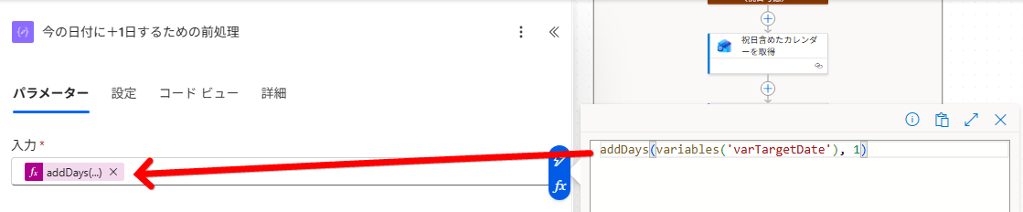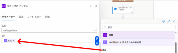 前のステップ(前処理の作成アクション)で「現在の日付に+1日した日付(明日の日付)」を一時的に計算しました。