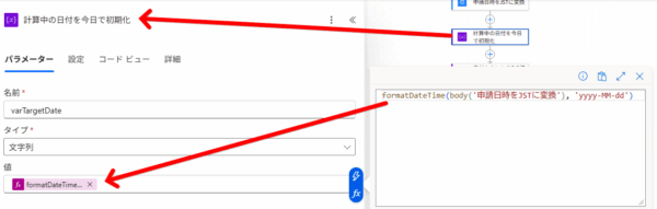 本題とズレるため式の説明は書略しますが、このアクションより前で取得したMicrosoft Formsの回答日付を”今日”として変数を初期化している、というだけです。