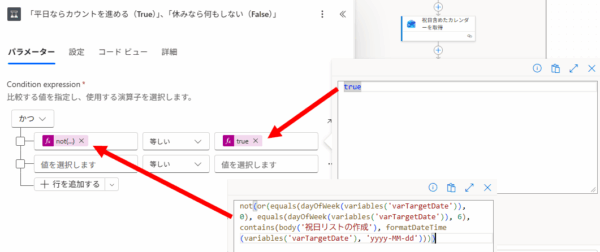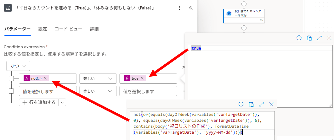 not(or(equals(dayOfWeek(variables('varTargetDate')), 0), equals(dayOfWeek(variables('varTargetDate')), 6), contains(body('祝日リストの作成'), formatDateTime(variables('varTargetDate'), 'yyyy-MM-dd'))))