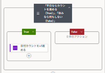 「平日ならカウントを進める(True)」、「休みなら何もしない(False)」