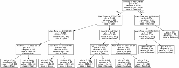 そこで今回は、機械学習の手法の一つである「決定木」を使い、アラートの対応条件を分析する方法を試しました。決定木を用いることで、Policy Type(種類)、Policy Severity(重要度)、そしてAlert Time(発生時期)といった複数の変数を同時に扱い、「チームの対応ルールがいつ、どのように変化したか」を解明することを目指します。