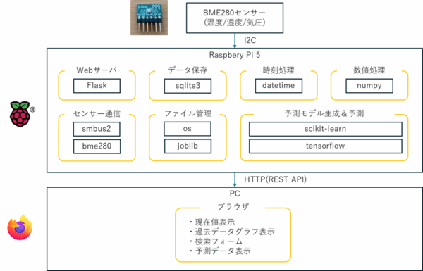| Webサーバ | Flask | 軽量なWebフレームワーク。センサー値や予測結果をWebアプリとしてブラウザに表示。 |