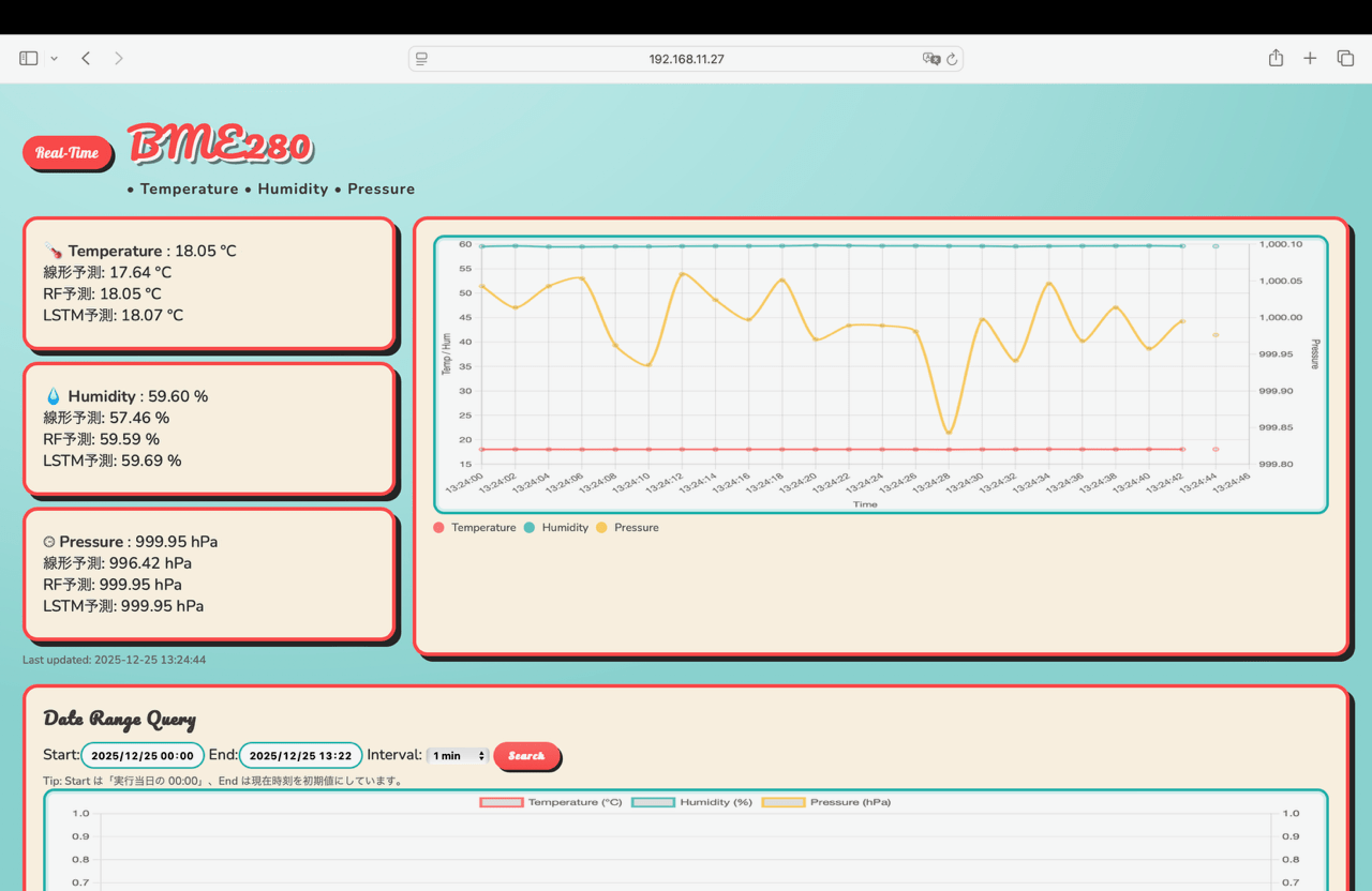 今回は測定したデータからAIを使って気温/気圧/湿度をリアルタイム予測してみます。