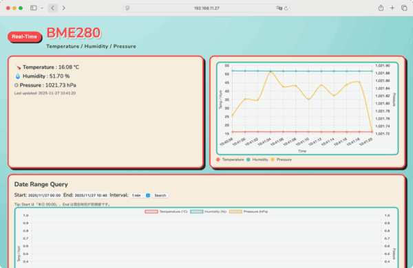 FlaskでWebページを作り、以下を表示します。- 最新の値(温度・湿度・気圧)