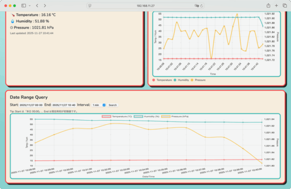 ブラウザは2秒ごとに新しい測定値を取りに行き、自動でグラフや数値を更新します。 - データ検索