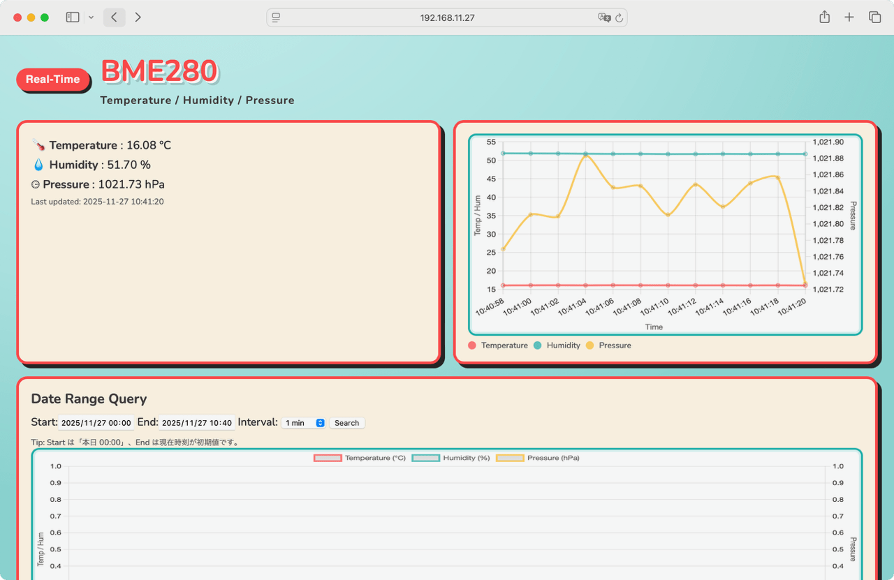 FlaskでWebページを作り、以下を表示します。- 最新の値(温度・湿度・気圧)