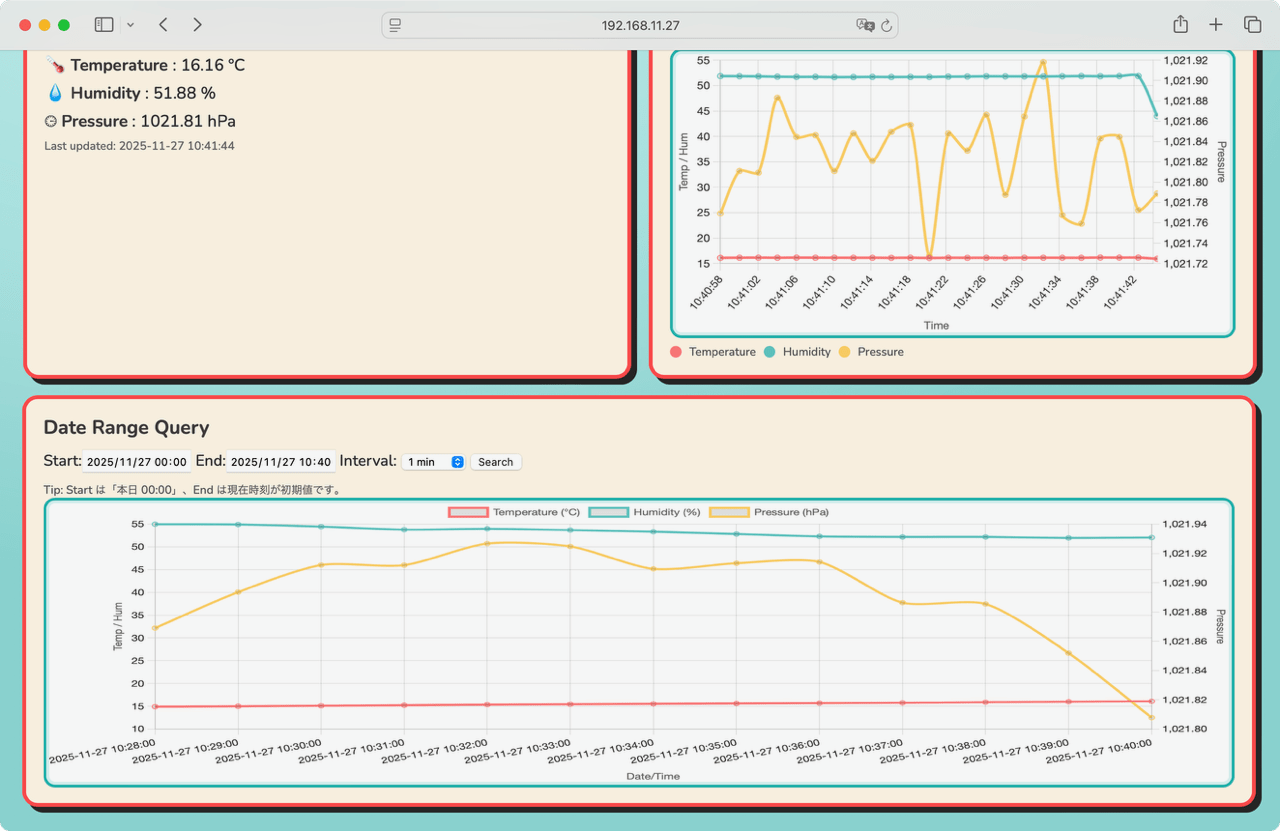 ブラウザは2秒ごとに新しい測定値を取りに行き、自動でグラフや数値を更新します。 - データ検索