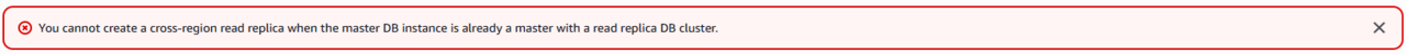 こちらは AWS コンソールからもサクッと試せそうだったので、RDS の配下に Aurora レプリカを構成した状態で、RDS のクロスリージョンレプリカを作ろうとしたところ・・