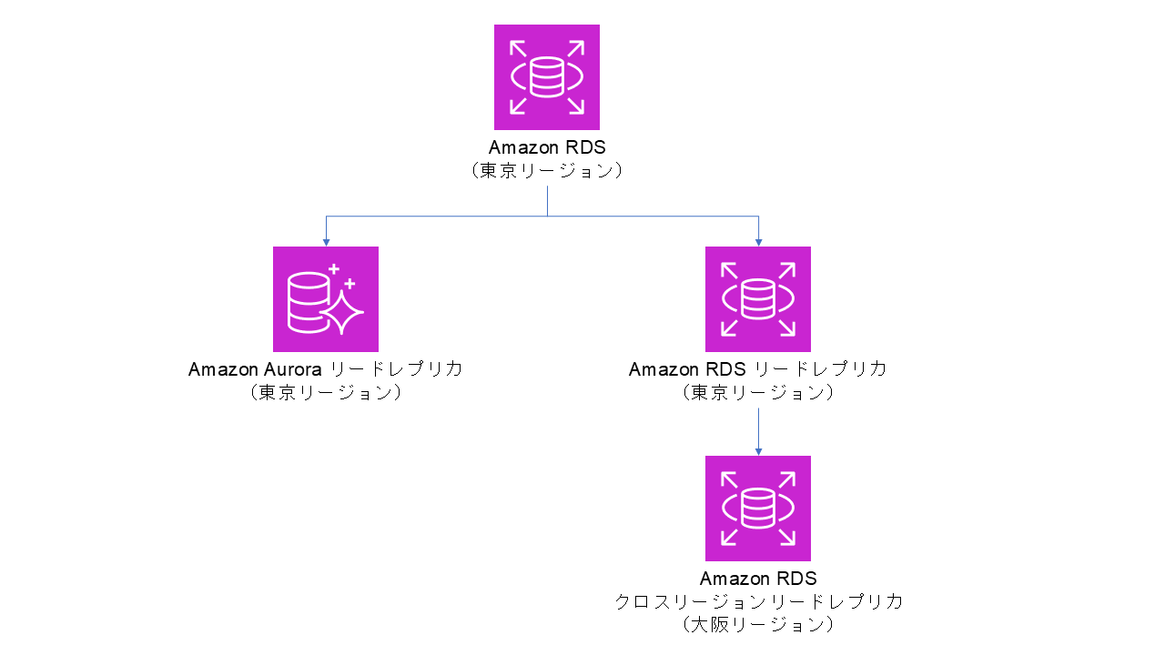 先述したエラーの内容からして「同一」RDS の配下に Aurora レプリカと RDS クロスリージョンレプリカが同居できないだけなのでは?と推測し、以下のように RDS クロスリージョンレプリカとの間に同リージョン内の RDS リードレプリカを挟むような構成にした結果、問題なく構成できました。