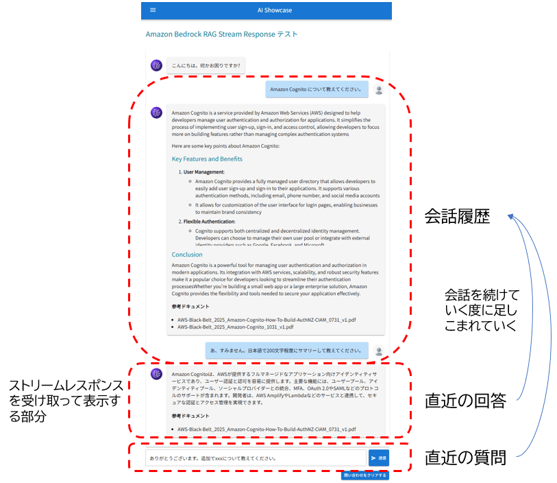 - 画面から問い合わせすると、回答が文字列細切れのストリームで返ってきます。それらをアプリ側で結合して、順次画面に表示しています。