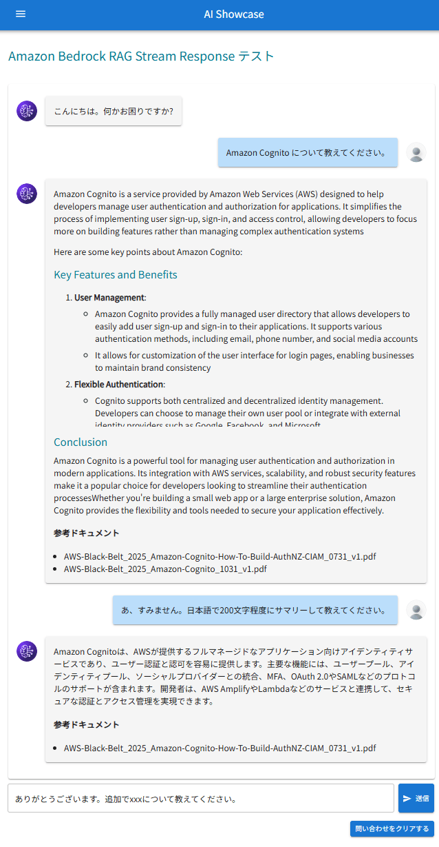 Amazon Bedrock Knowledge Bases で RAG チャットボットを開発するときの UI 開発例を紹介しました。細かい説明はないので、コードの不明点は生成 AI に聞いてもらえると理解が進むと思います。