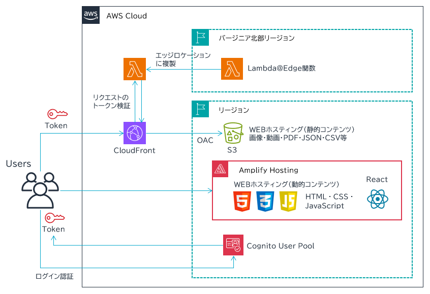 React アプリにログインをすると、Amazon Cognito ユーザープールからトークンをもらえます。アプリから Amazon S3 にある静的コンテンツへのリクエストを行うときにトークンを含め、間に存在する Amazon CloudFront 上で Lambda@Edge 関数によりトークンの正当性をチェックさせるという仕組みです。
