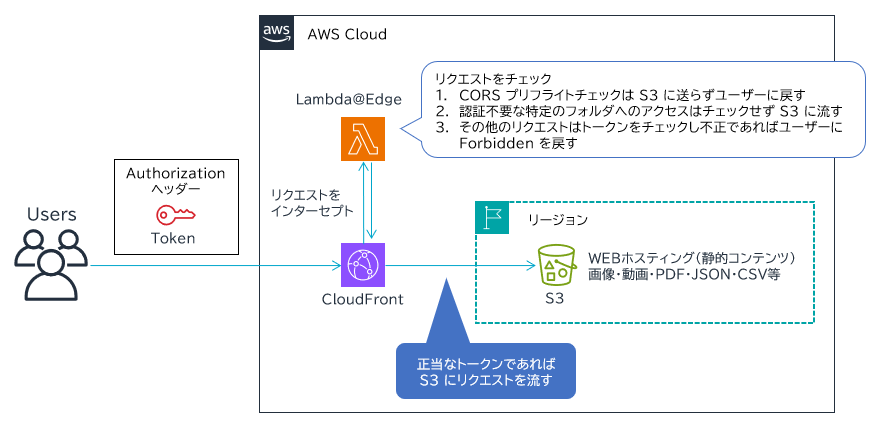 - その他のリクエストはトークンのチェックが必要です。Authorization ヘッダーにあるトークンの正当性を Lambda@Edge 関数内でチェックし、正当であれば Amazon S3 にリクエストを流します。不正であった場合は Amazon CloudFront に 403 Forbidden のレスポンスを戻すと、CloudFront がアプリにそれを戻してくれます。
