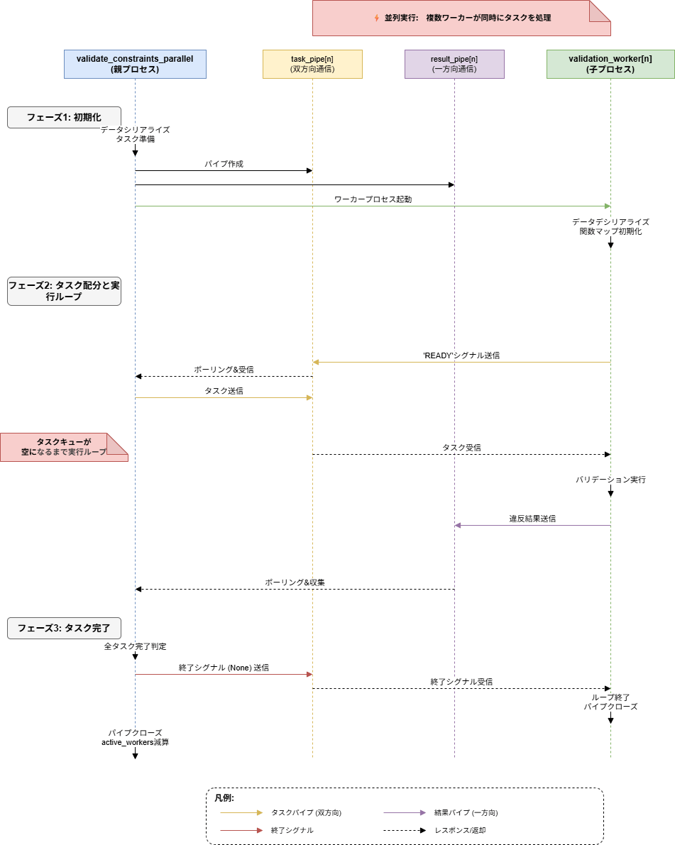 - 並行して result_pipes も定期的に polling し、子プロセス側で完了しているバリデーションチェックの結果があれば取得