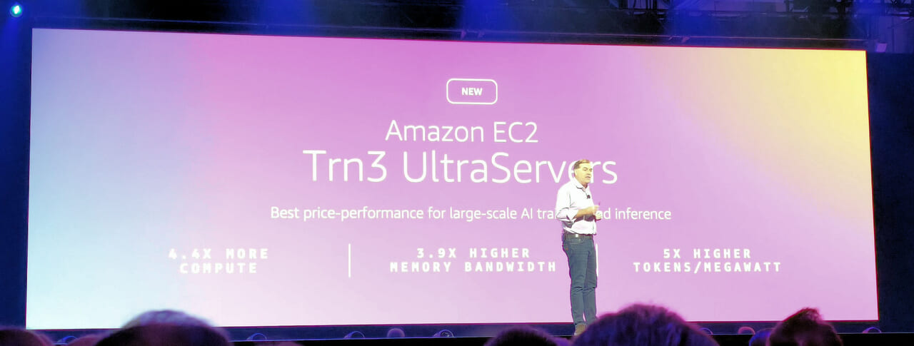 Matt Garman CTOのキーノートでは、冒頭多めの時間をとって、新しいAI学習用チップであるTrainium3プロセッサと、それを144基搭載したTrn3 UltraServersの発表がありました。