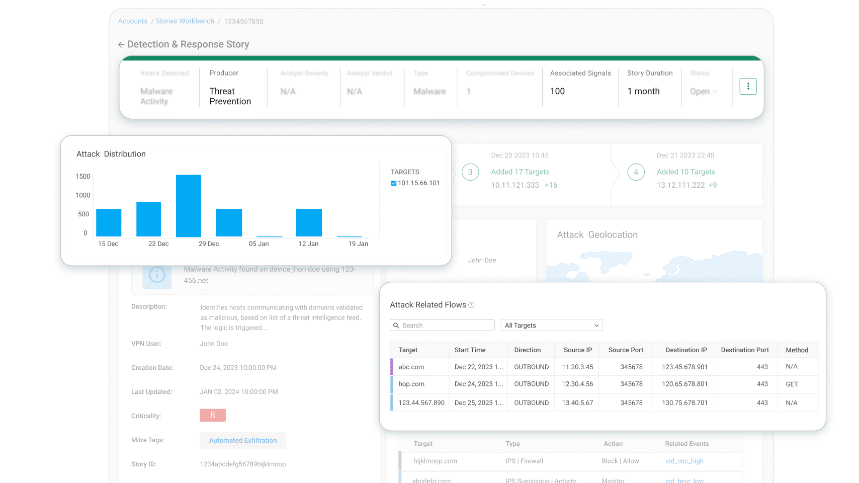 攻撃者のジオロケーション・ソース(3)を見ることができる。これも疑わしい。次に、「ターゲットの行動」ボックス(4)を見ると、このストーリーに関係するすべてのターゲットに関連する行動を見ることができる。これは脅威狩りのストーリーであるため、広範なシグナルの間に相関関係を見ることができる。