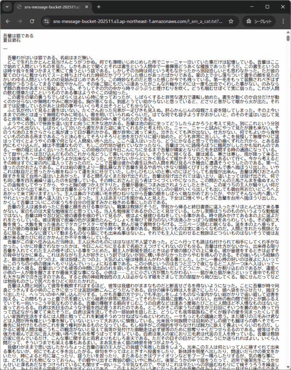 $message = "以下は夏目漱石の「吾輩は猫である」の全文です。`n`n全文はこちら!`n" + $presignurl