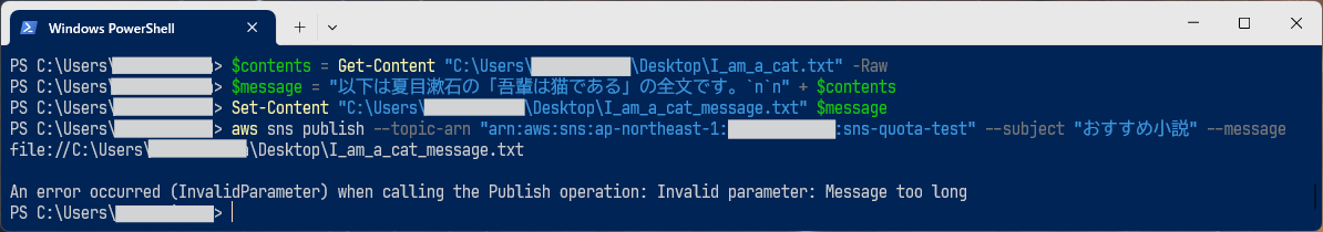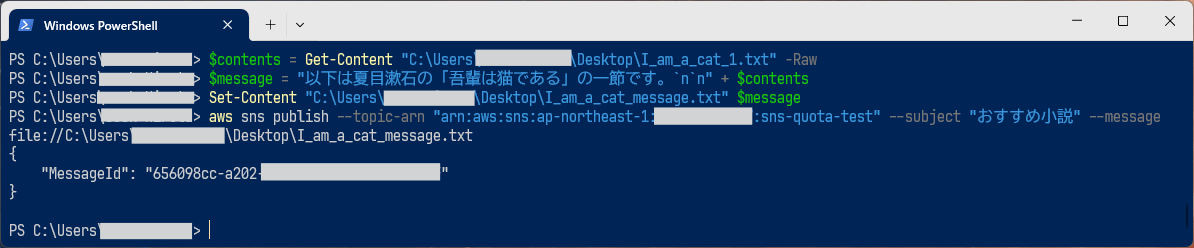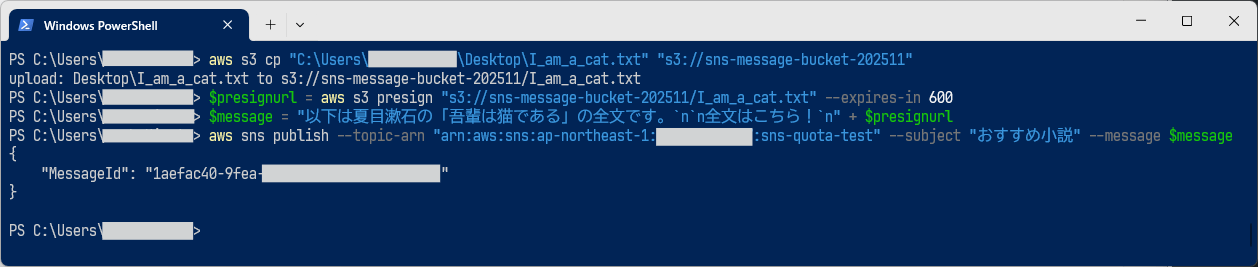 aws sns publish --topic-arn "arn:aws:sns:[リージョン]:[アカウントID]:[トピック名]" --subject "おすすめ小説" --message $message