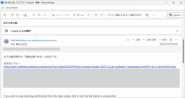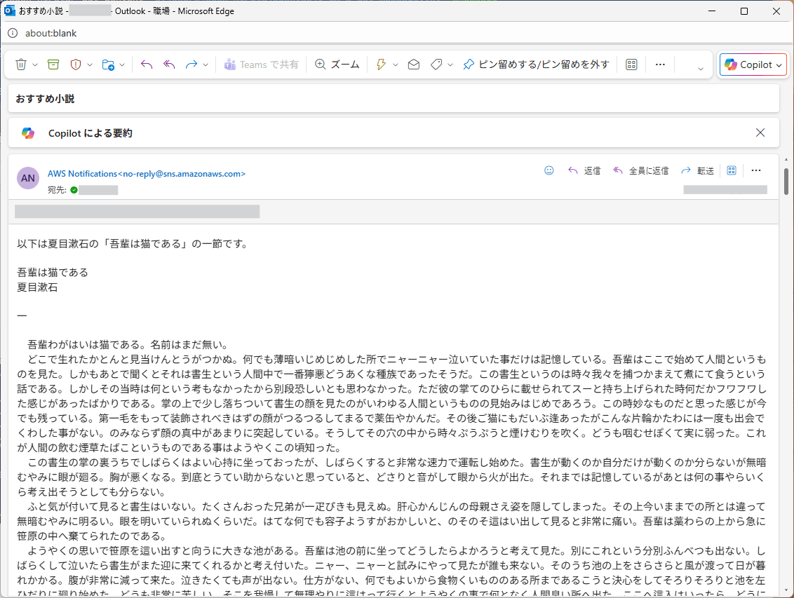 aws sns publish --topic-arn "arn:aws:sns:[リージョン]:[アカウントID]:[トピック名]" --subject "おすすめ小説" --message file://[メール本文のテキストファイル]