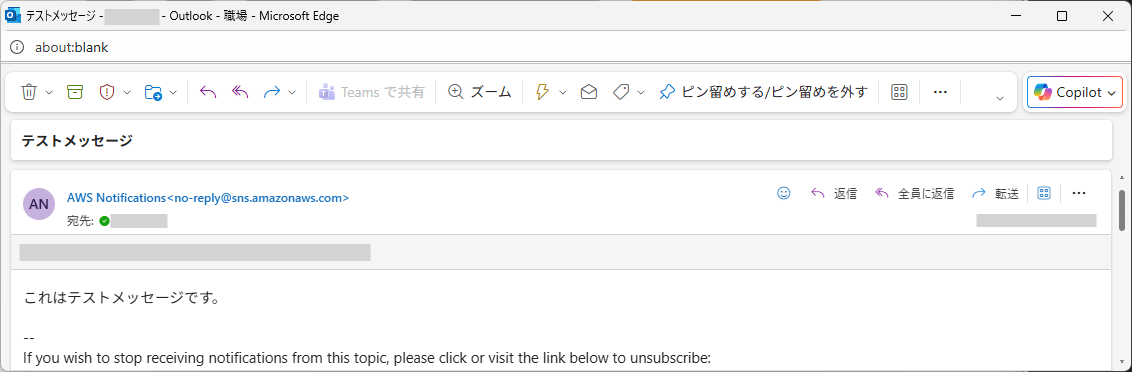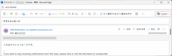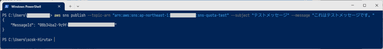 aws sns publish --topic-arn "arn:aws:sns:[リージョン]:123456789012:[トピック名]" --subject "[題名]" --message "[本文]"